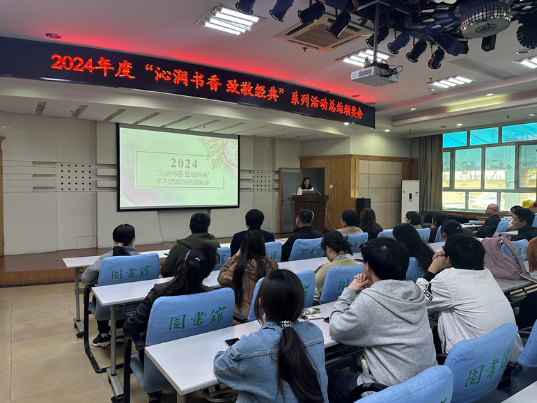 9月25日下午,图书馆在多功能厅召开了“沁润书香 致敬经典”系列活动总结表彰会。图书馆主要领导、数据商负责人、获奖读者代表及学生读者近80余人参会。会议由阅读推广部主任刘明主持。