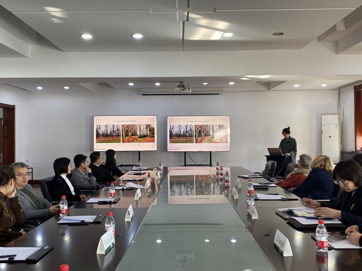 座谈会由园林学院副院长毛靓主持。会上,园林学院院长王竞红回顾了两校前期开展的合作情况,介绍了园林学院概况。思维特拉娜女士介绍了圣彼得堡国立林业技术大学基本情况。双方达成一致共识:针对寒地城市景观设计和植物多样性保护等领域开展教学交流、学生短期访学、科研合作和教师交流等深入合作。