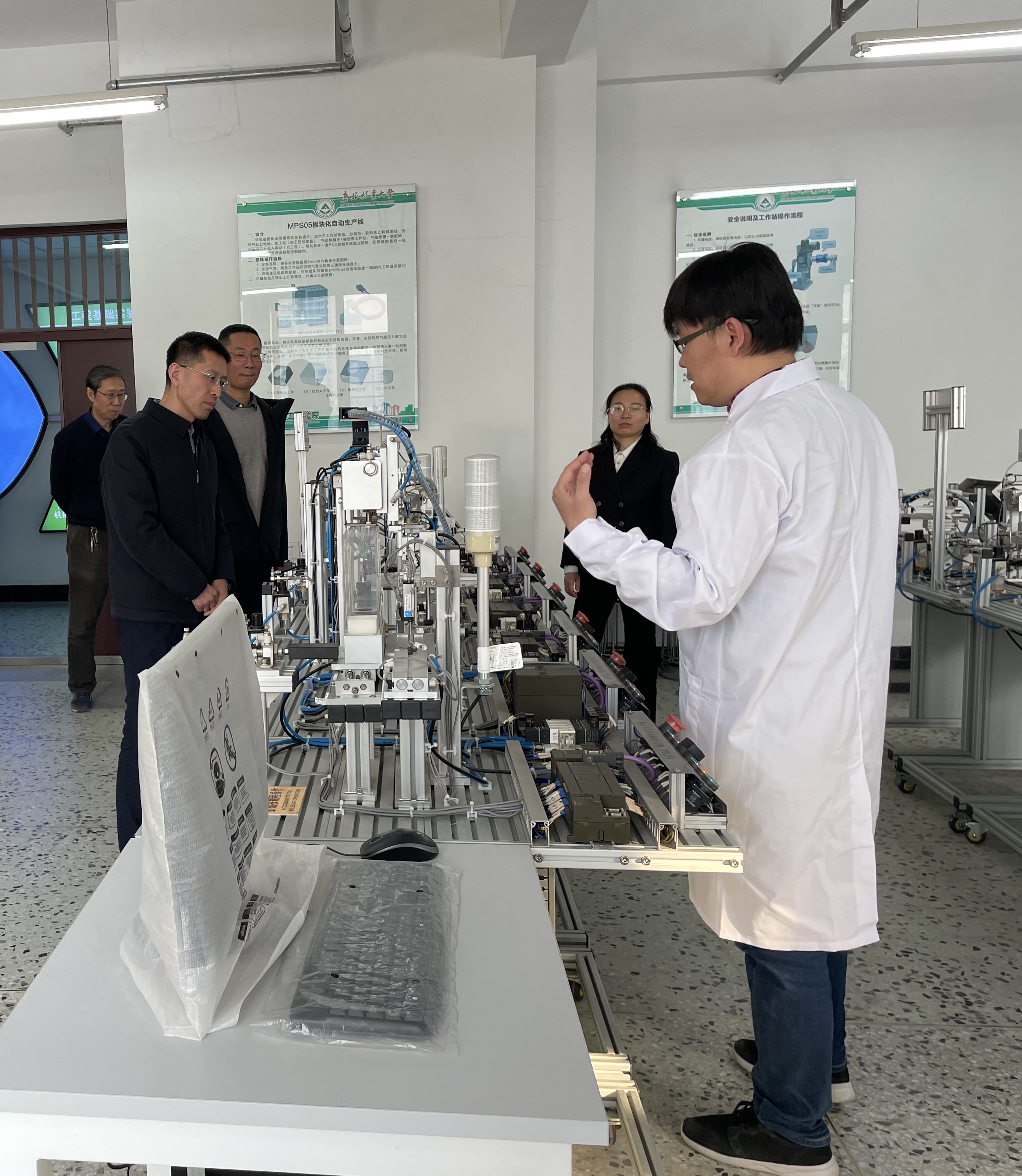 专家组现场考查了学院亚德客实训室、气动实验室、数控技术实验室、大学生科创作品展览室等场地,与学院主要领导、教师代表进行了深度访谈。