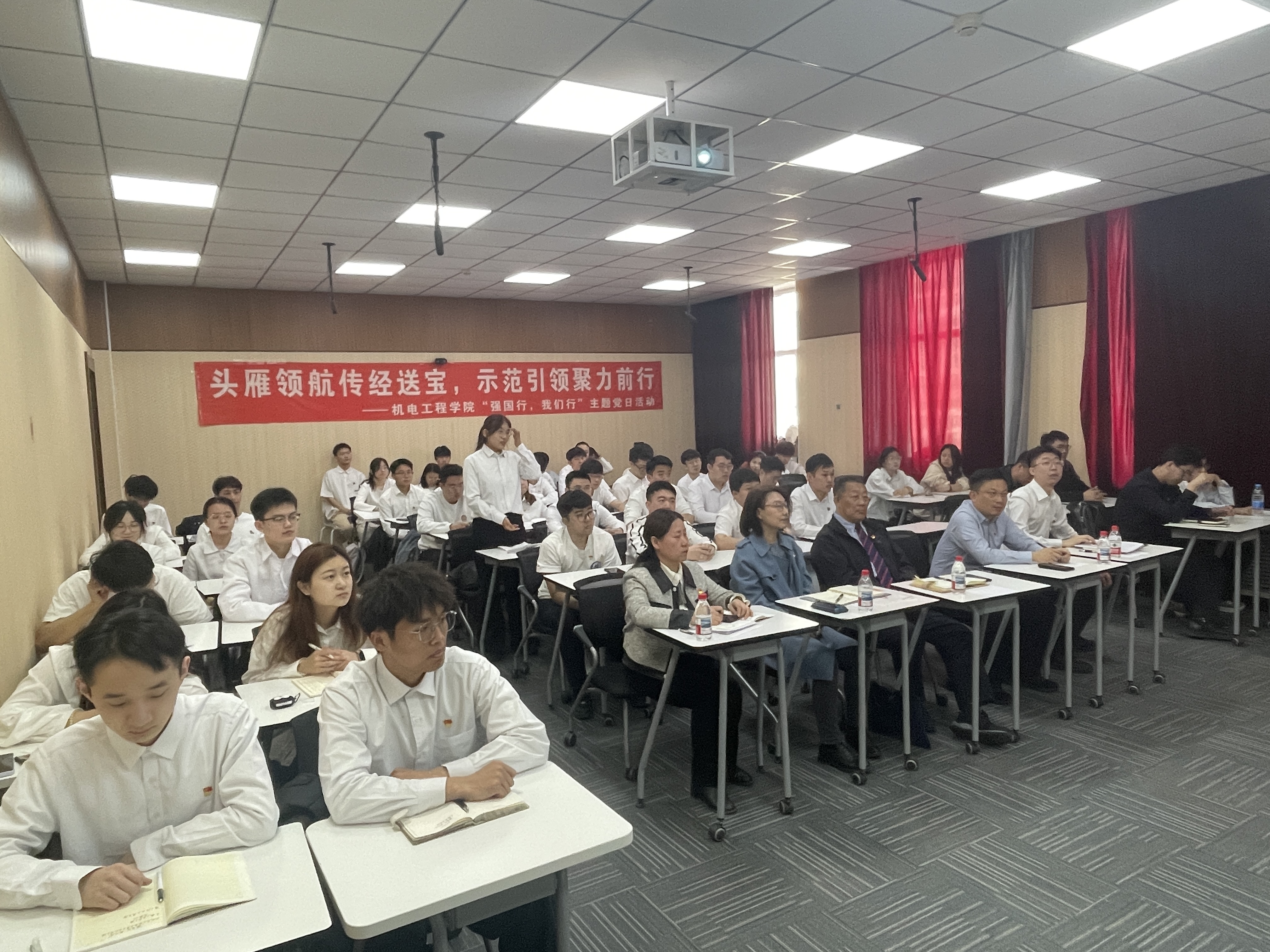 王佳彤简要介绍了举办此次主题党日活动的特殊背景:一是时间节点特殊。恰逢“五一”国际劳动节、五四青年节来临,统筹国内经济工作和国际经贸斗争,深入贯彻中央八项规定精神,落实《教育强国建设规划纲要(2024—2035年)》,筹备召开学校第十四次党代会,迎接本科教育教学审核评估的关键时期。二是参加人员特殊。既有经验丰富、德高望重的教育部党建联络员列席,也有党员领导干部、教师党员、学生党员、入党积极分子各层面代表。三是活动内容特殊。“强国行”专项行动团队负责人、全省高校样板党支部书记、全省优秀教育工作者联袂上台,共话成长、进步、思考,互学互鉴、互联互促。希望大家认真聆听,深入学习,广泛交流,为实现以高质量党建引领高质量发展的机电党建工作贡献力量。