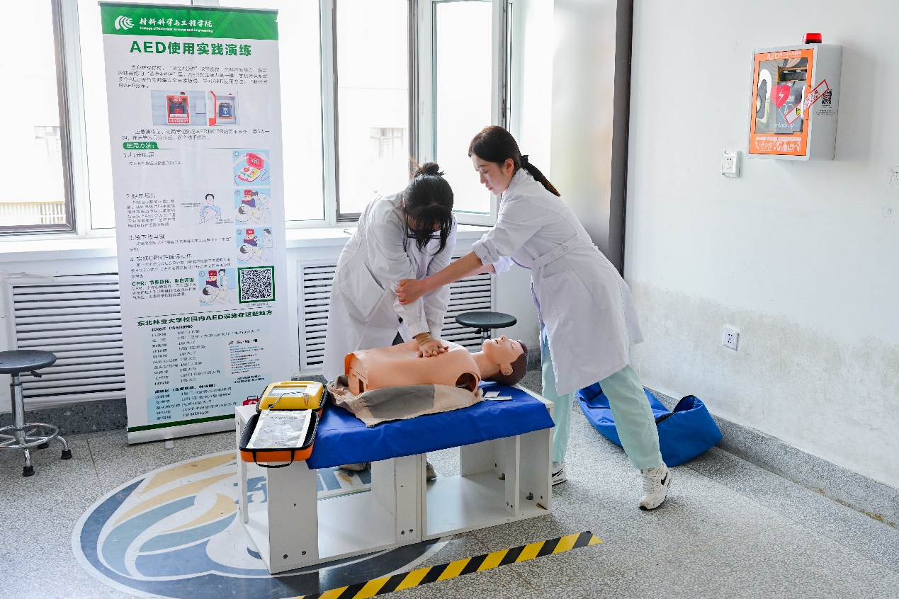 AED急救演练是本次演练新增内容。校医院副院长马直勉现场演练人体模型演示心肺复苏术(CPR)与自动体外除颤器(AED)协同操作流程,参训师生分组完成“判断意识-呼叫救援-胸外按压-除颤电击”全流程实操,掌握“第一目击者”急救技能。