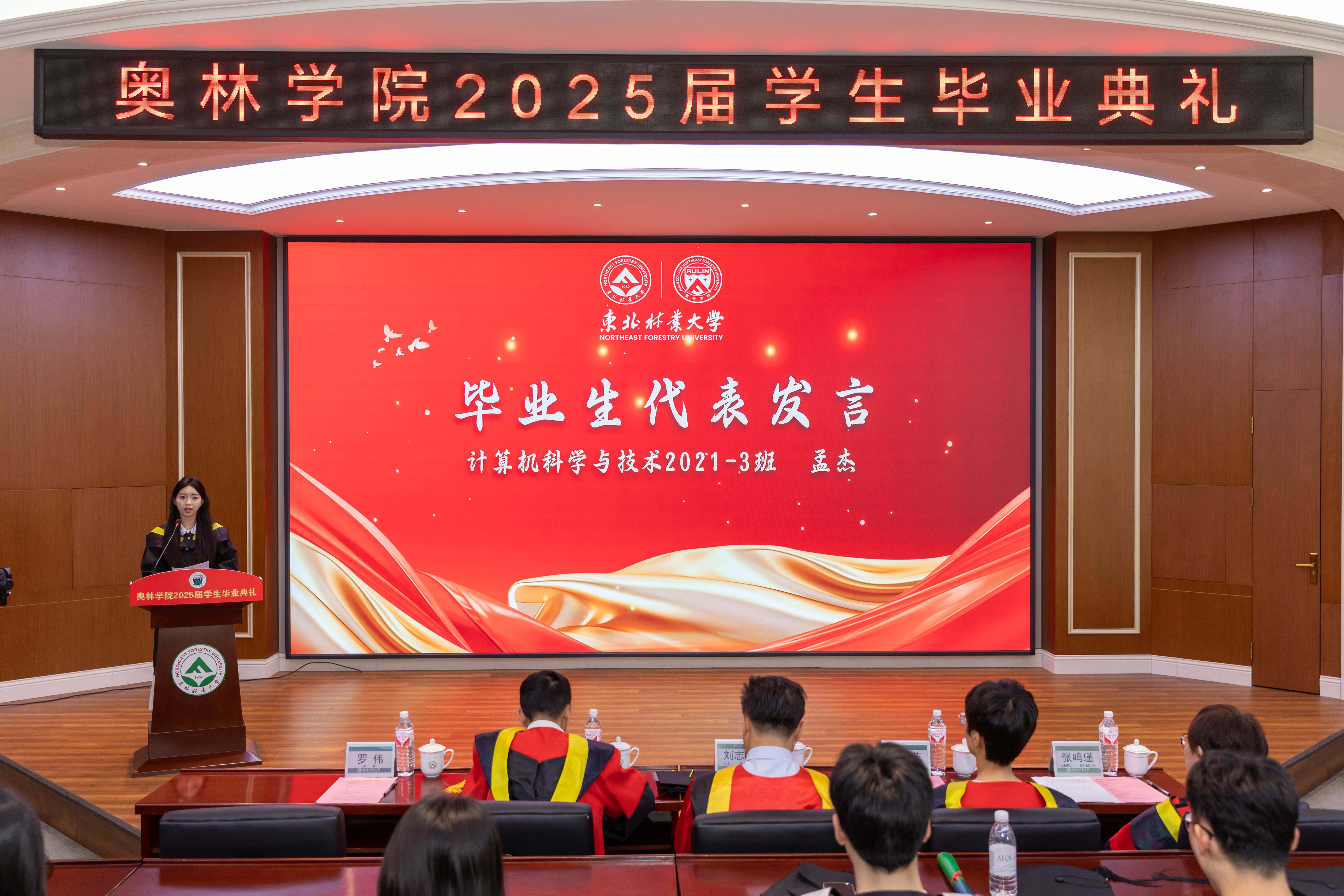 毕业生代表、2021级计算机科学与技术专业3班孟杰同学代表学院全体2025届毕业生向学院、师长、父母和亲友表示感谢,她以树木比喻,用“扎根”、“生长”和“成材”三个关键词分享自身成长体悟。