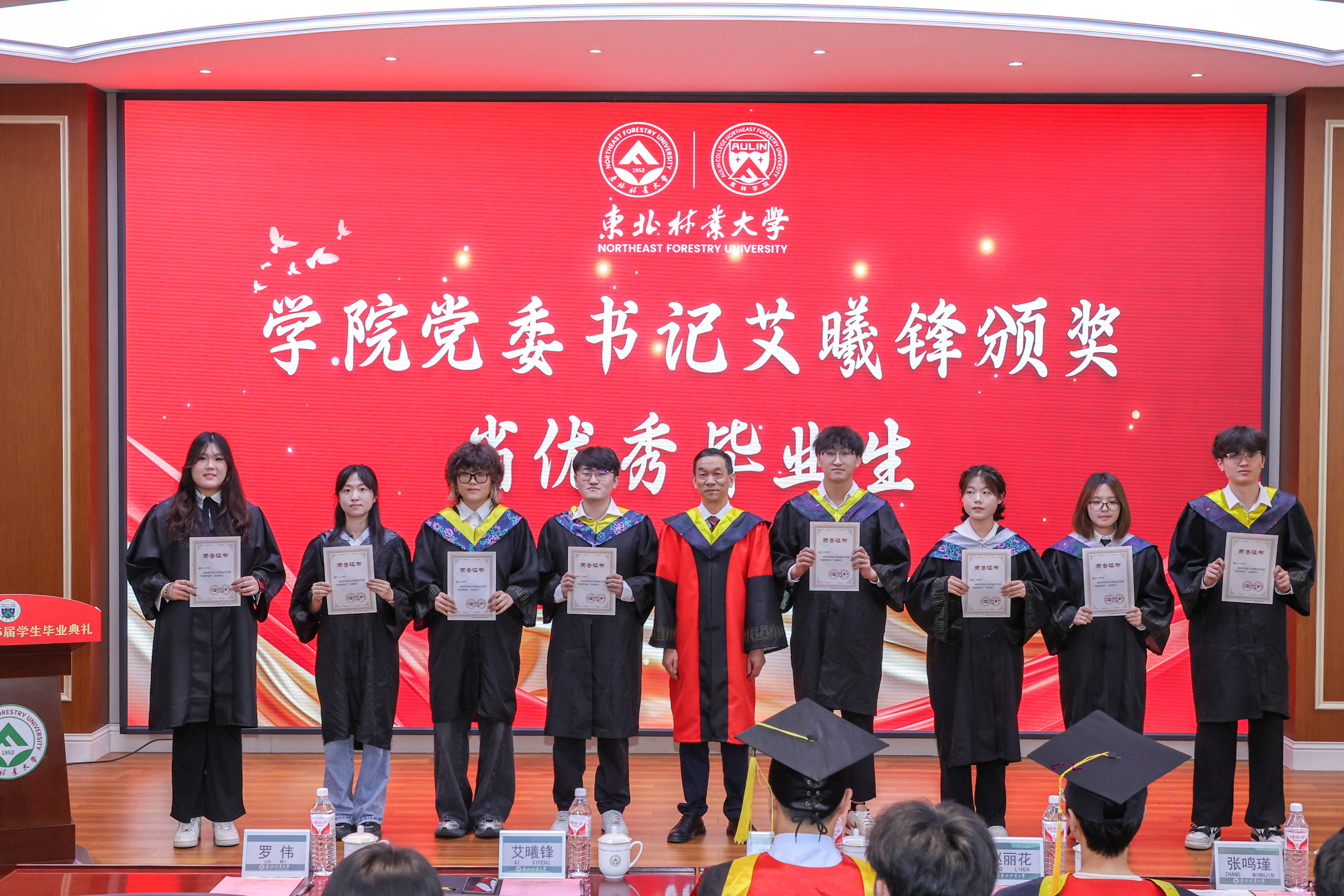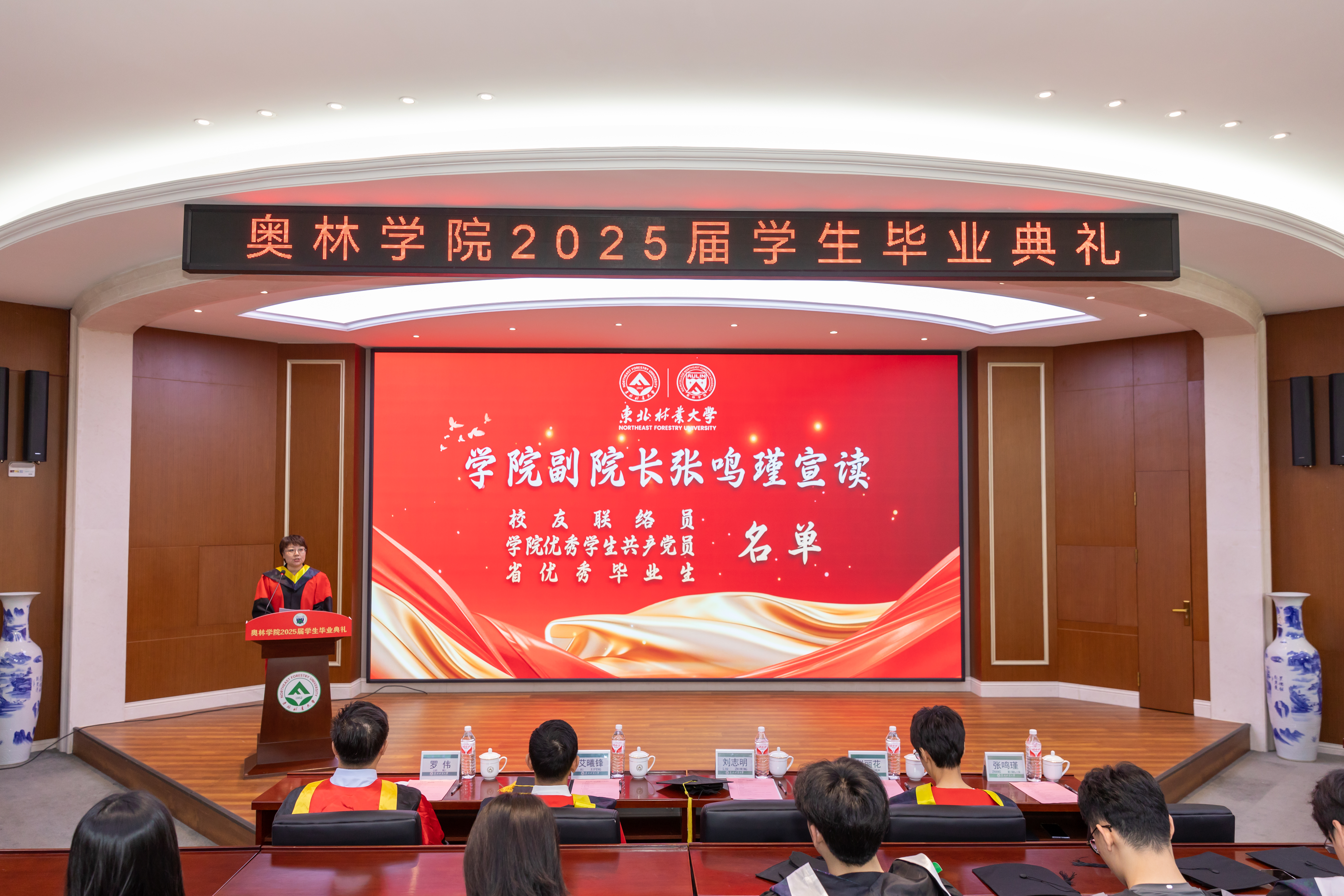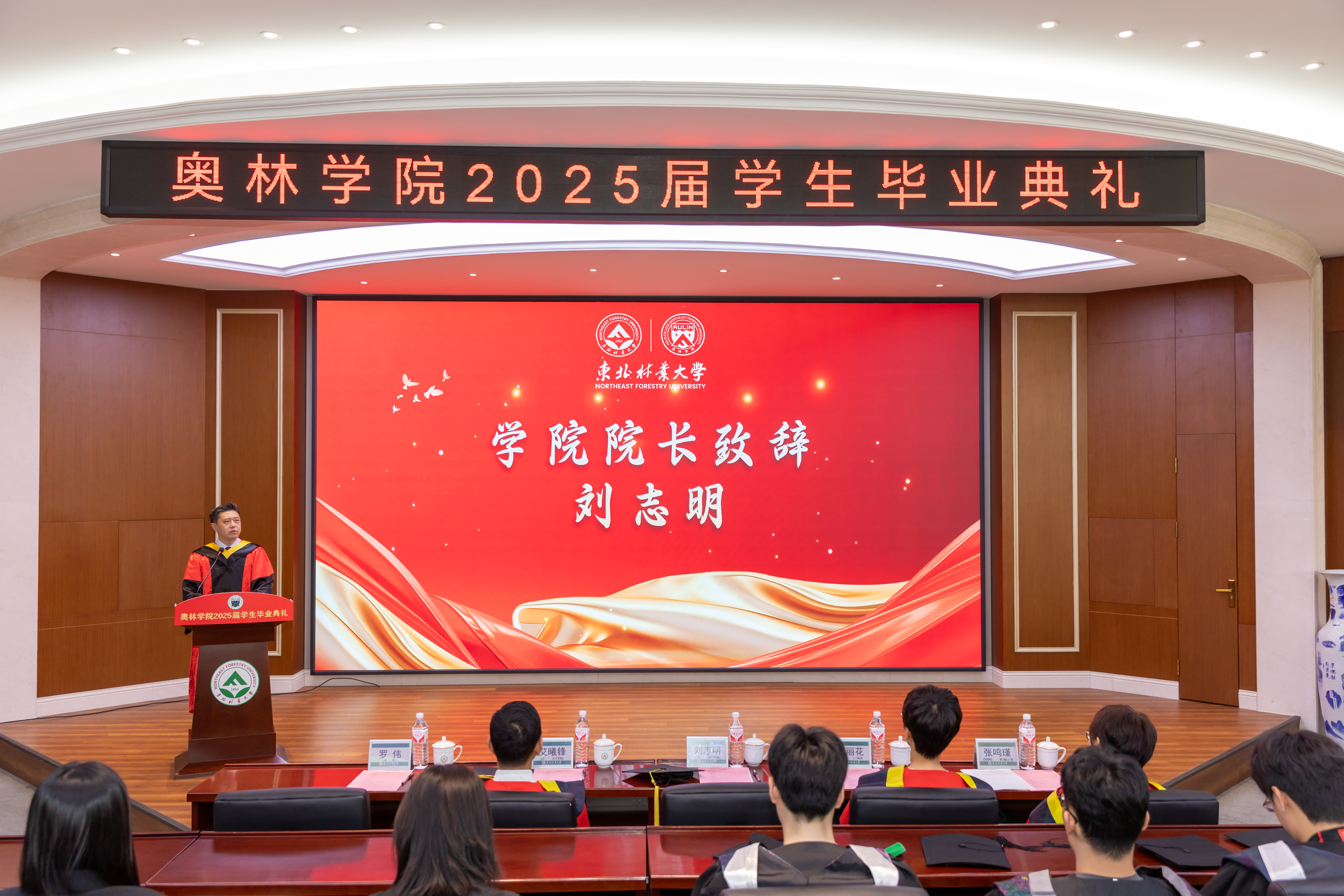 毕业生代表王润杰、赵慧哲向学院献上饱含寓意的吉祥物作为临别之礼,“奥兰兰”和“林东东”既体现了以林育人的生态文明理念和东林精神,又彰显着对于可持续发展的深刻承诺和实际行动。
