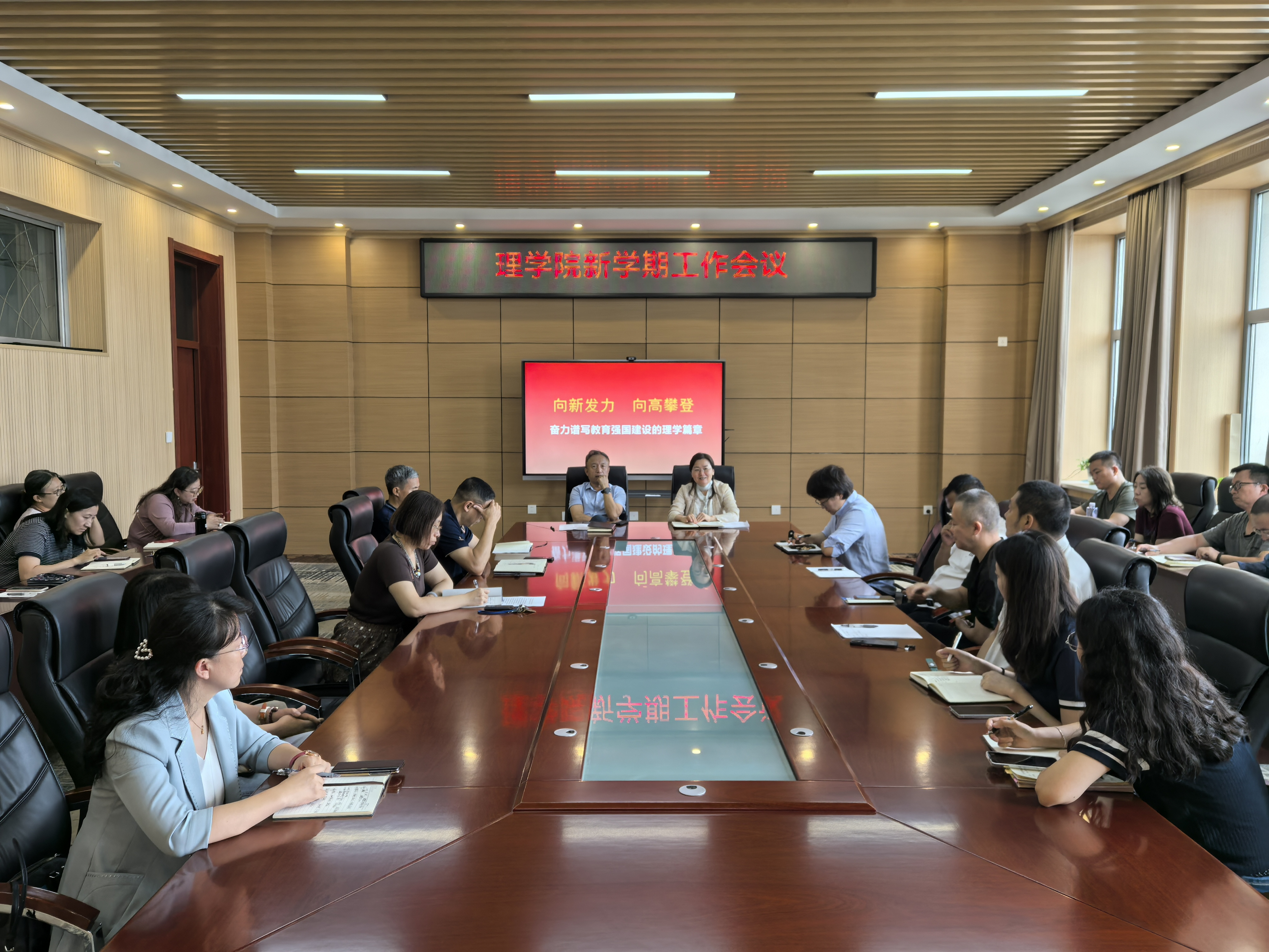 8月28日,理学院召开新学期工作会议,深入学习贯彻学校第十四次党代会精神,全面部署新学期重点任务,奋力开创学院高质量发展新局面。学院班子成员、院长助理、办公室主任、工会主席、团委书记、党委组织员、系主任、党支部书记、学科带头人(负责人)、专业负责人、教研室(实验室)主任、双创中心主任(副主任)、辅导员、教学秘书、科研秘书等参加会议。院长安勇主持会议。