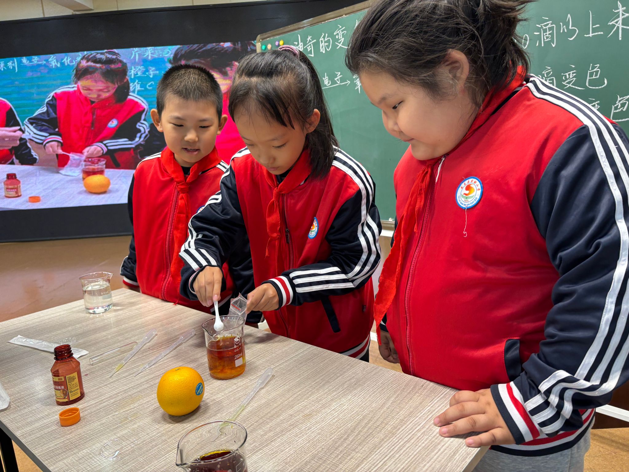 在《光的神奇之旅》课堂上,实验小学四年级的245名学生通过大学生讲师的系统阐述、直观演示与启发式教学,了解了光现象背后的科学规律;在《神奇的变色游戏》课堂上,实验小学三年级的289名学生与大学生讲师一同探索氧化还原反应的奥秘;在“维生素C使高锰酸钾溶液褪色”、“维生素C还原碘”等趣味实践环节中,学生踊跃参与,现场气氛热烈,表现出对科学探索的浓厚兴趣。