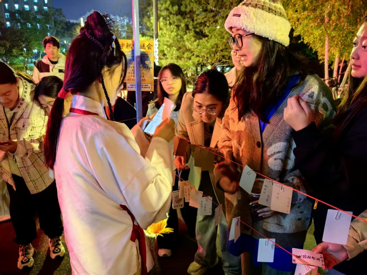 活动现场,除了紧张有趣的猜谜环节,还穿插了诸多沉浸式传统文化体验。在汉服体验区,不少同学在工作人员的帮助下换上精致汉服,手持团扇漫步于灯笼之下,仿佛穿越回古代中秋夜,纷纷拍照留念,记录下这独特的文化瞬间。