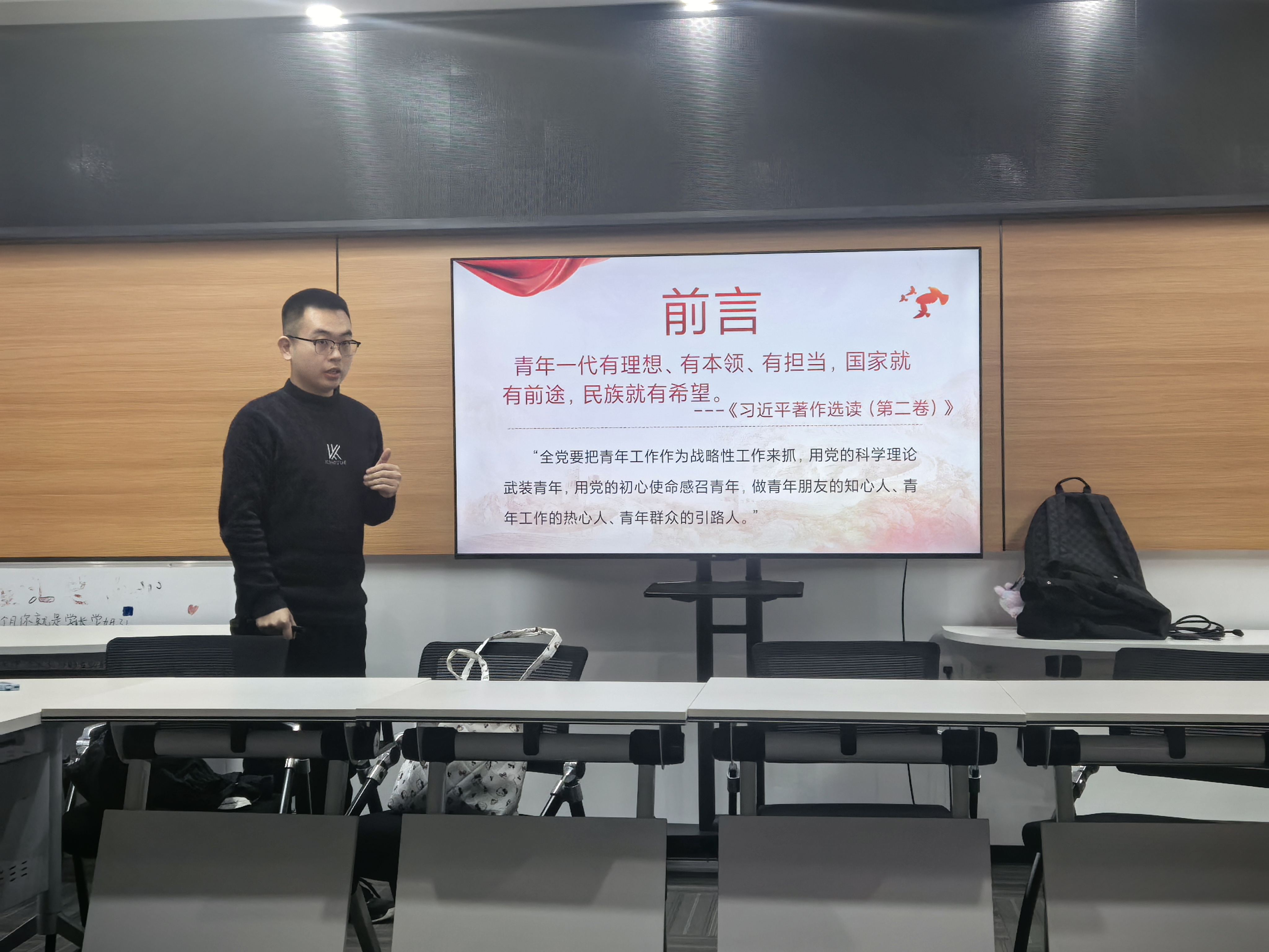 主持人回顾了习近平总书记对青年的殷切期望,强调阅读《习近平论教育》《习近平与大学生朋友们》等书籍,以及学习习近平总书记给青年师生的寄语回信内容的重要意义,引导大家感悟党和国家对青年一代的关爱与嘱托。