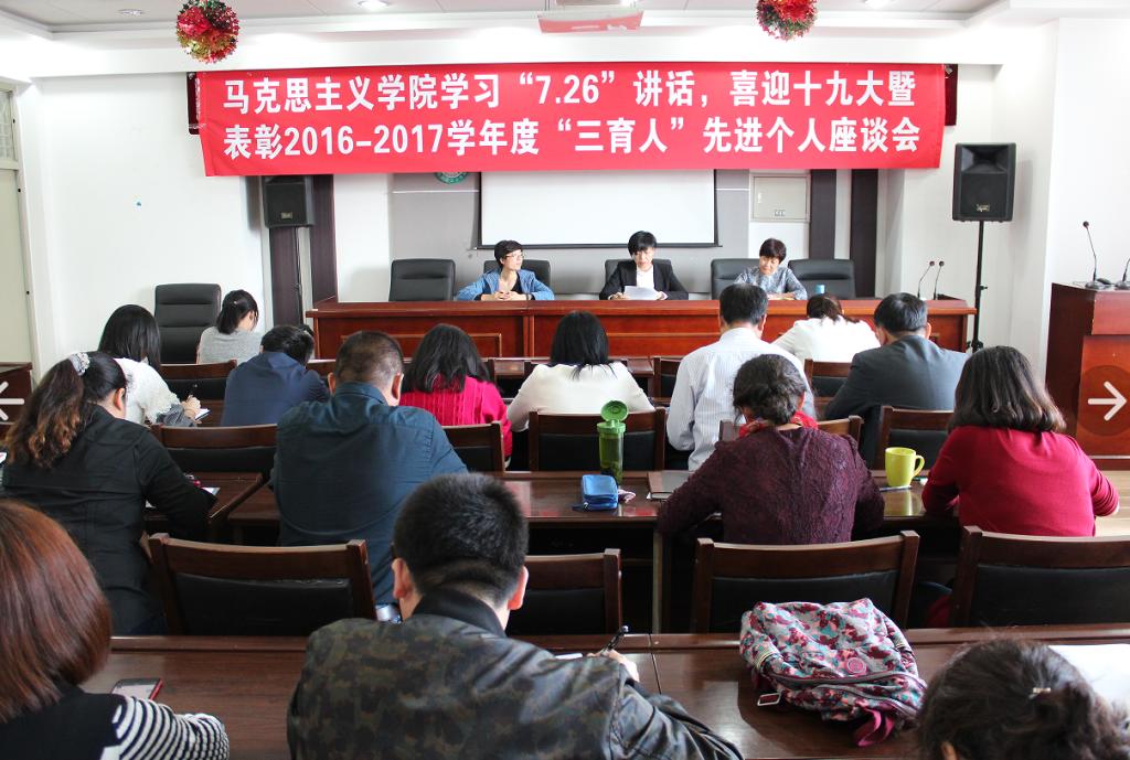 为扎实推进“两学一做”常态化制度化,深入学习贯彻习近平总书记“7.26”重要讲话精神,结合庆祝教师节先进典型的表彰活动,马克思主义学院于2017年9月20日14:00在文博楼921学术报告厅,举办了以学习“7.26”讲话,喜迎十九大为主题的表彰座谈活动。会上,对2016-2017学年度学院“教书育人”表现突出的典型进行了表彰,就2017年暑期学校工作研讨会精神、校党委张志坤书记和李斌校长在2017年秋季学期工作会议上讲话精神进行了学习和传达,通报了中共教育部党组、中央纪委驻教育部纪检组《关于中管高校党员干部教师违反八项规定精神问题典型案例的通报》,围绕学习习近平总书记7.26重要讲话精神,喜迎十九大召开思政课教师代表专题座谈会。学院班子成员、全体教职工参加了会议,会议由学院党总支书记魏晓慧主持。