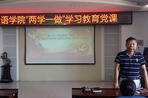 为纪念中国共产党成立96周年、迎接党的十九大胜利召开,进一步落实党中央、教育部党委、中共黑龙江省省委、中共东北林业大学委员会“两学一做”学习教育制度化、常态化实施方案的要求,7月12日下午2点,外国语学院党委组织全院教工党员在文博楼1019会议室进行了一次党员集体组织生活会,由孙爽副院长作了题为《深入学习贯彻落实“两学一做” 助推学院科研与研究生教育工作再上新台阶》的主题党课讲座。讲座由外国语学院党委书记杨滨章主持。