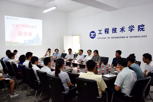 为了深入贯彻落实全国高校思想政治工作会议精神和习近平总书记关于学习黄大年同志先进事迹的重要指示精神,充分发挥先进典型的示范引领作用,全面加强师德师风建设,进一步加强和改进学院思想政治教育工作,6月28日下午,工程技术学院在工程楼五楼会议室召开了向黄大年同志学习座谈会。副校长李顺龙、党委学生工作部副部长学生处副处长王志新、学院领导班子成员、教师代表参加了座谈会,会议由学院党委书记姚永明主持。