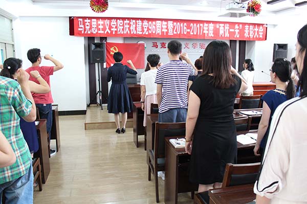 在中国共产党成立96周年之际,为推进“两学一做”常态化学习教育,深入学习领会习近平总书记对黄大年同志先进事迹做出和重要指示精神,发挥典型示范作用。2017年6月28日下午1点30分,马克思主义学院在文博楼921学术报告厅举行了庆祝建党96周年党员系列教育活动,本次党员教育活动有三项内容:一是预备党员入党宣誓、老党员重温入党誓词活动;二是表彰2016-2017年度“优秀共产党员”、“优秀党务工作者”和“先进党支部”活动;三是开展黄大年同志先进事迹专题学习活动。本次学习教育活动由学院党总支书记魏晓慧主持。