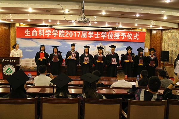 在雄壮而庄严的国歌声中,学位授予仪式正式开始。滕春波副院长首先宣布2017届毕业生学位授予决定,共计163名本科毕业生获得了理学学士学位。学院的四位学科带头人为全体毕业生颁发了学位证书并拨正流苏。随后张明书记与隋广超副院长宣布了生命科学学院关于表彰2017届优秀毕业生的决定及校、院优秀毕业生名单。姚力等17名同学获得“东北林业大学优秀毕业生”荣誉称号,冷东瑾同学等37名同学获得“生命科学学院优秀毕业生”荣誉称号。随后主席台就座的各位领导和老师为获奖毕业生颁发了证书和纪念品。