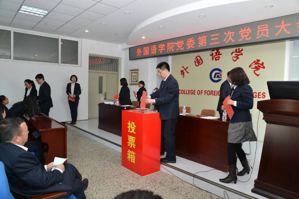 接着,大会听取了上届党委组织委员陈志伟同志所做的《中共外国语学院委员会关于党费收缴、上交情况报告》,并以同样热情的掌声对报告予以通过。大会第三项议程是由党委委员董辉同志宣读和主持通过新一届党委换届选举办法,宣读和主持通过总监票人和监票人名单。紧接着,由党委委员孙爽同志宣读和介绍了新一届党委委员、纪委委员候选人名单。在总监票人华裕涛同志的主持下,监票人赵丽莉、高慧敏及四位计票人对到场的党员人数进行了清点,然后清理票箱,并发放选票。随后,随后与会党员井然有序地投下自己庄重的一票。在计票人和监票人统计选票的过程中,与会党员观看了全国政协十二届五次大会召开的盛况。当总监票人华裕涛同志宣布完投票结果时,会场再次响起了热烈的掌声。接着,孙爽同志分别宣布了当选的新一届党委委员和纪委委员名单,他们分别是(按姓氏笔画排序)党委委员:王丹、孙爽、李想、陈志伟、杨滨章、郭林、董辉;纪委委员:李想、张刚、洪雪娇。