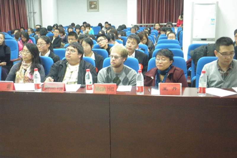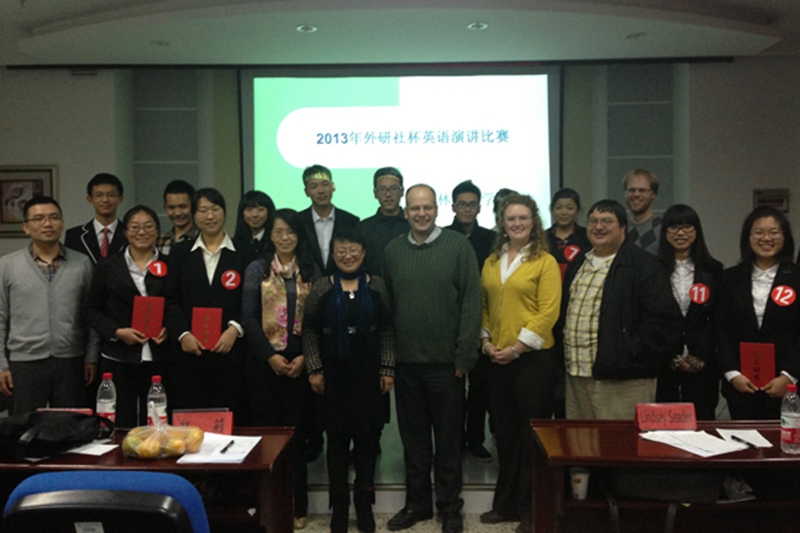 2013年10月16日晚6:00,“外研社杯”全国英语演讲大赛东林赛区决赛在文博楼1019室正式拉开帷幕,担任本场比赛的评委有外国语学院院长王丹教授、外国语学院英语系主任赵莉教授、大学外语部华裕涛老师,以及英语系外教Ben Watson,Micah Hitt,Lindsey Seader和Steven Yue,特邀嘉宾有2013级政治辅导员袁野老师。比赛分三个环节进行,分别是自我介绍、命题演讲和外教提问。最后根据评委们打分结果,评出各奖项的获得者。