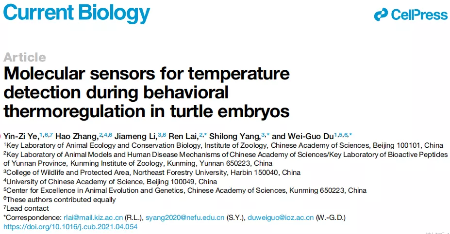 2021年5月19日,杜卫国团队联合我校杨仕隆团队和中国科学院昆明动物研究所赖仞研究团队,在Cell子刊Current Biology(Top期刊5-year IF=10.2)上发表了题为“Molecular sensors for temperature detection during behavioral thermoregulation in turtle embryos”的研究论文,揭示了爬行动物胚胎行为热调节的分子基础。通过行为学、分子生物学、激光瞬时温控、电生理和药理学等整合生物学研究手段,研究人员发现TRPA1和TRPV1是胚胎行为热调节过程中感知温度变化的关键离子通道。TRPA1用于感受温和热刺激(28-32℃)并帮助乌龟胚胎向热源移动,而当温度进入伤害性热刺激范围时(>32℃),TRPV1激活并帮助乌龟胚胎远离热源。因此,在胚胎行为热调节中,TRPA1和TRPV1形成了一个无缝连接的生理分子温度计用于检测卵内的不同温度区域并调整胚胎所处的位置。