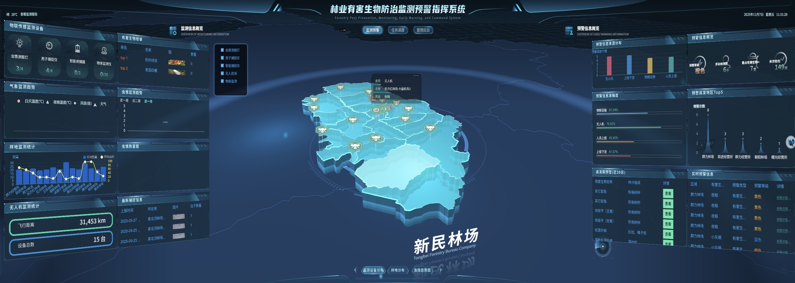 第一个“1”是构建一套“空-天-地”立体感知系统,天上接入卫星遥感数据,实时捕捉植被覆盖变化、大范围火点预警等宏观动态;空中依托无人机管理系统,完成巡检航线智能规划、高清影像实时回传与自动化分析;地面部署红外相机、水质监测仪、智能虫情测报灯等设备,精准采集动植物活动、水文环境、病虫害发生等微观数据,三者协同织就一张无死角的林区监测网络。