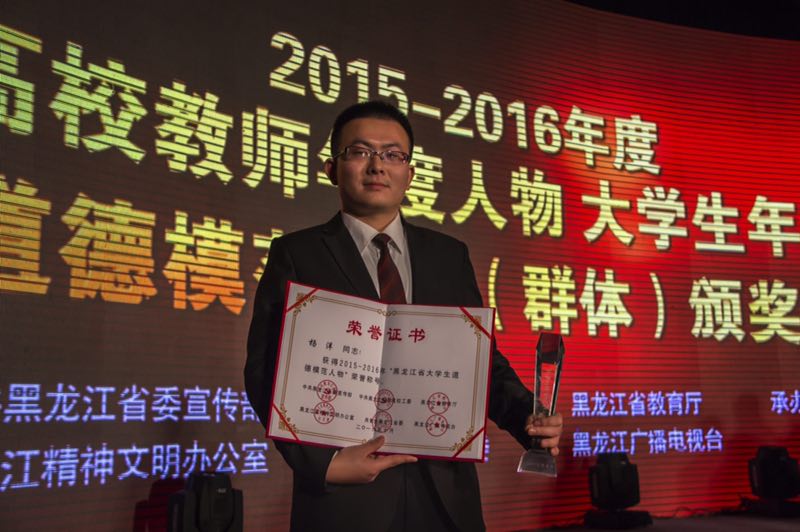 杨洋获得2015—2016年度黑龙江省高校教师、大学生年度人物暨道德模范人物(群体)评选“大学生道德模范人物”称号