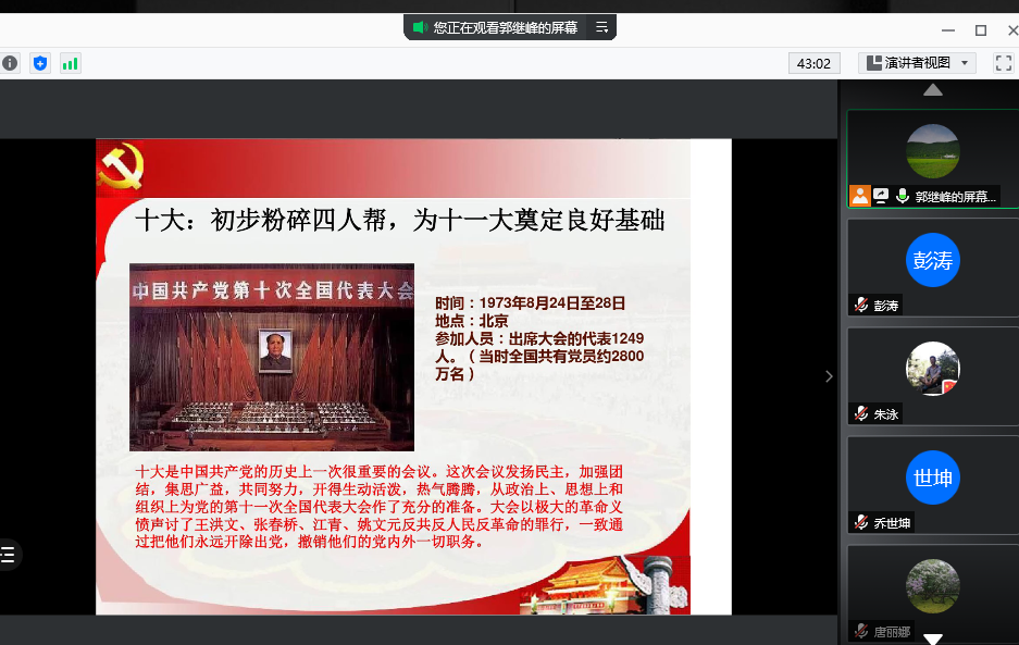 4月12日晚,支部以腾讯会议的形式进行了“支部委员讲党史”活动的第一讲:以历次中国共产党全国代表大会为主线深入进行党史学习活动。第一讲由支部书记郭继峰主讲,支部全体党员参加了学习活动,信息学院基础教育与实验中心朱泳老师作为群众代表参与了学习。