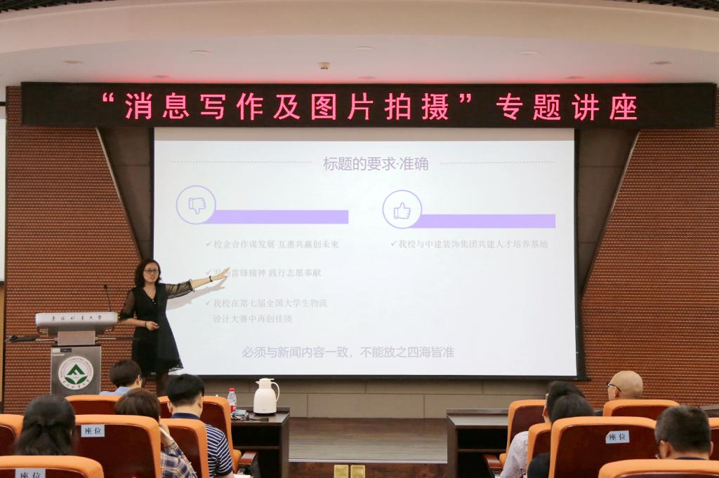 为贯彻落实习近平总书记关于加强我国国际传播能力建设的重要讲话精神,进一步提升教职工新闻写作能力,6月8日,学校党委宣传部副部长、新闻中心主任孟姝轶为国际交流学院直属党支部、奥林学院党委、图书馆党总支、实验室管理与条件保障处党支部等基层党组织的党员教师们,进行了题为“消息写作及图片拍摄”的专题讲座。讲座由国际交流学院直属党支部书记、院长骆颖主持。