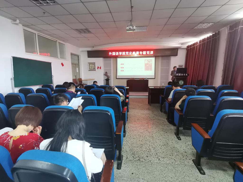 6月9日下午,外国语学院党委书记王丹在文博楼1019会议室为学院全体教师作题为《践行红船精神,担当时代使命》的专题党课,学院全体教师参与本次学习活动。