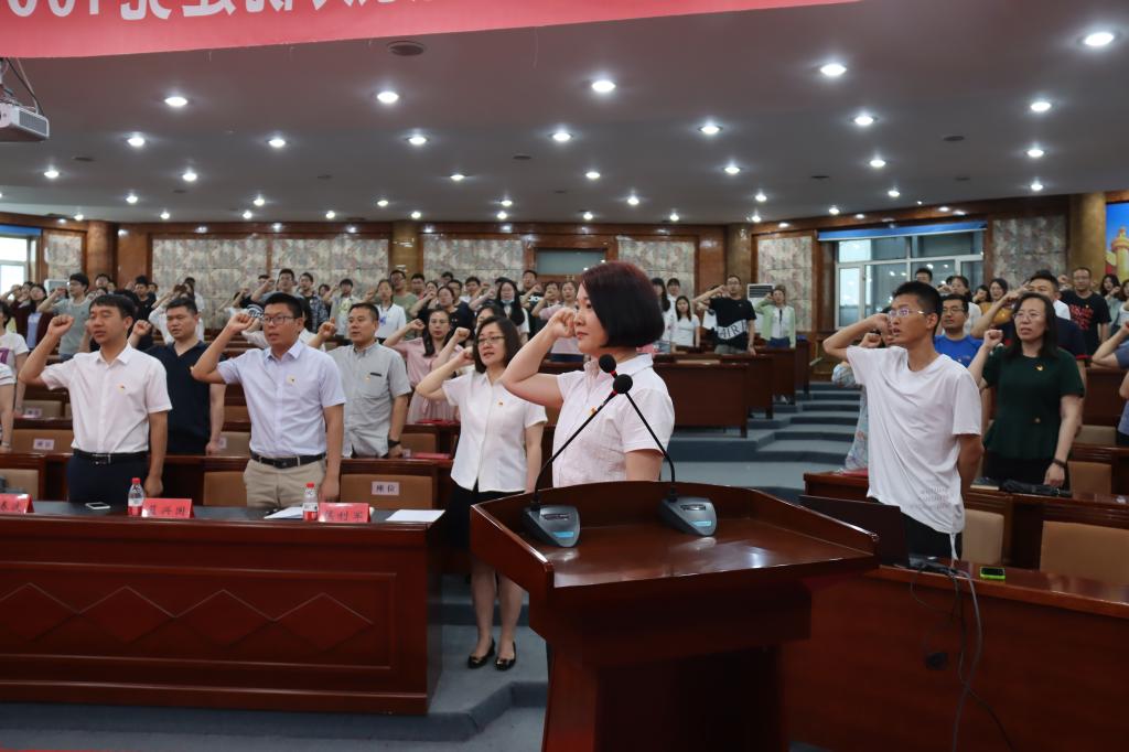 学院副处级辅导员郭婷婷带领全体党员重温入党誓词。全体党员佩戴党徽,高举右拳,面对鲜红的党旗,再次庄严宣誓。一字一句,神圣而豪迈,体现了党员同志们对中国共产党的无限忠诚,坚定了入党初心和奋斗使命。
