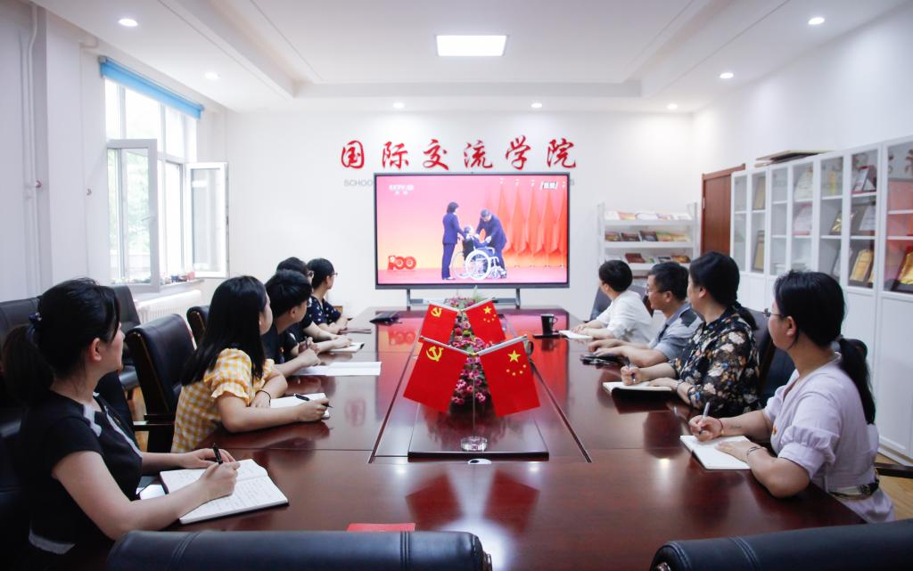 6月29日,国际交流学院直属党支部组织全体教职工在学院会议室收看庆祝中国共产党成立100周年“七一勋章”颁授仪式现场直播,聆听总书记重要讲话,学习先进模范,汲取奋进力量。